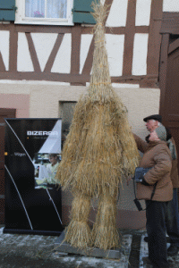 Hier der Langhalm-Strohbär, gefertigt aus 120cm langen Roggenstrohgarben.